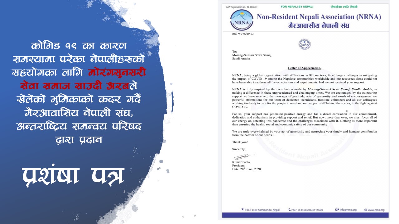 कोभिड १९ का कारण समस्यामा परेका नेपालीहरुको सहयोगका लागि मोरंगसुनसरी सेवा समाज साउदी अरबले खेलेको भुमिकाको कदर गर्दै गैरआवासिय नेपाली संघ, अन्तराष्ट्रिय समन्वय परिषदले प्रदान प्रशंषा पत्र गरेको छ ।